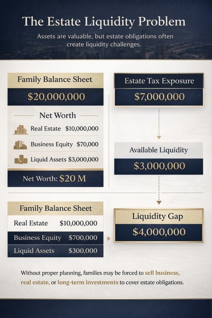 This example illustrates how a family with $20M in net worth could still face a $4M liquidity gap if most assets are concentrated in real estate or business equity.