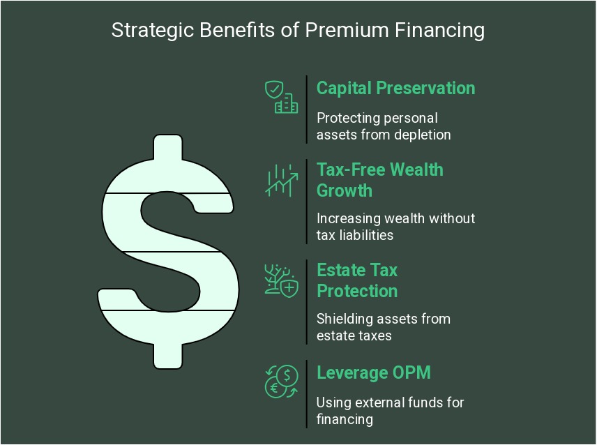 Premium financing life insurance offers a strategic approach to securing substantial life insurance policies without the need to deplete personal cash flow. This page outlines the key benefits of premium financing, including capital preservation, tax-free wealth growth, estate tax protection, and the ability to leverage other people’s money (OPM) for financing.