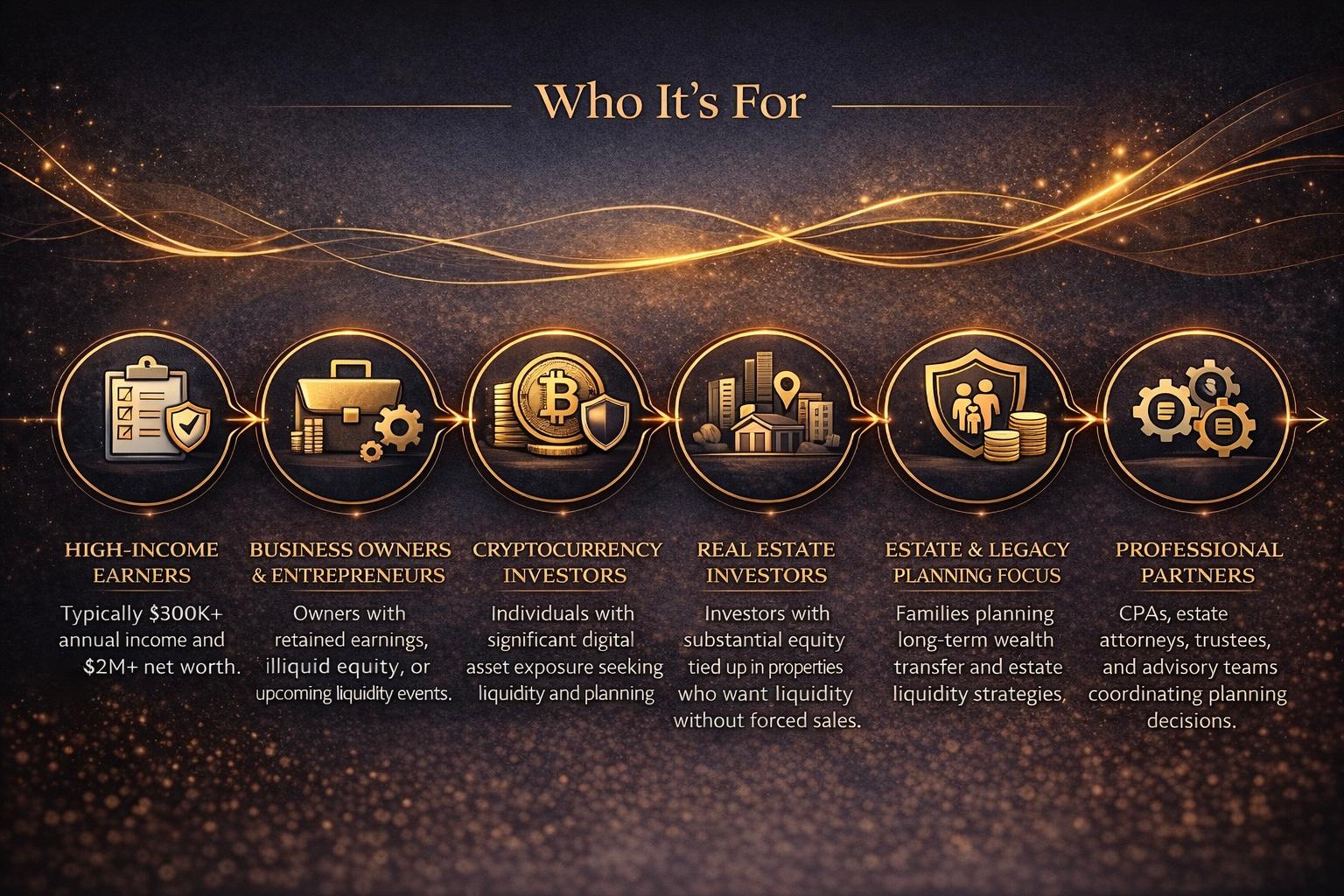 You typically earn $300,000 or more annually and have consistent income to support long term planning.